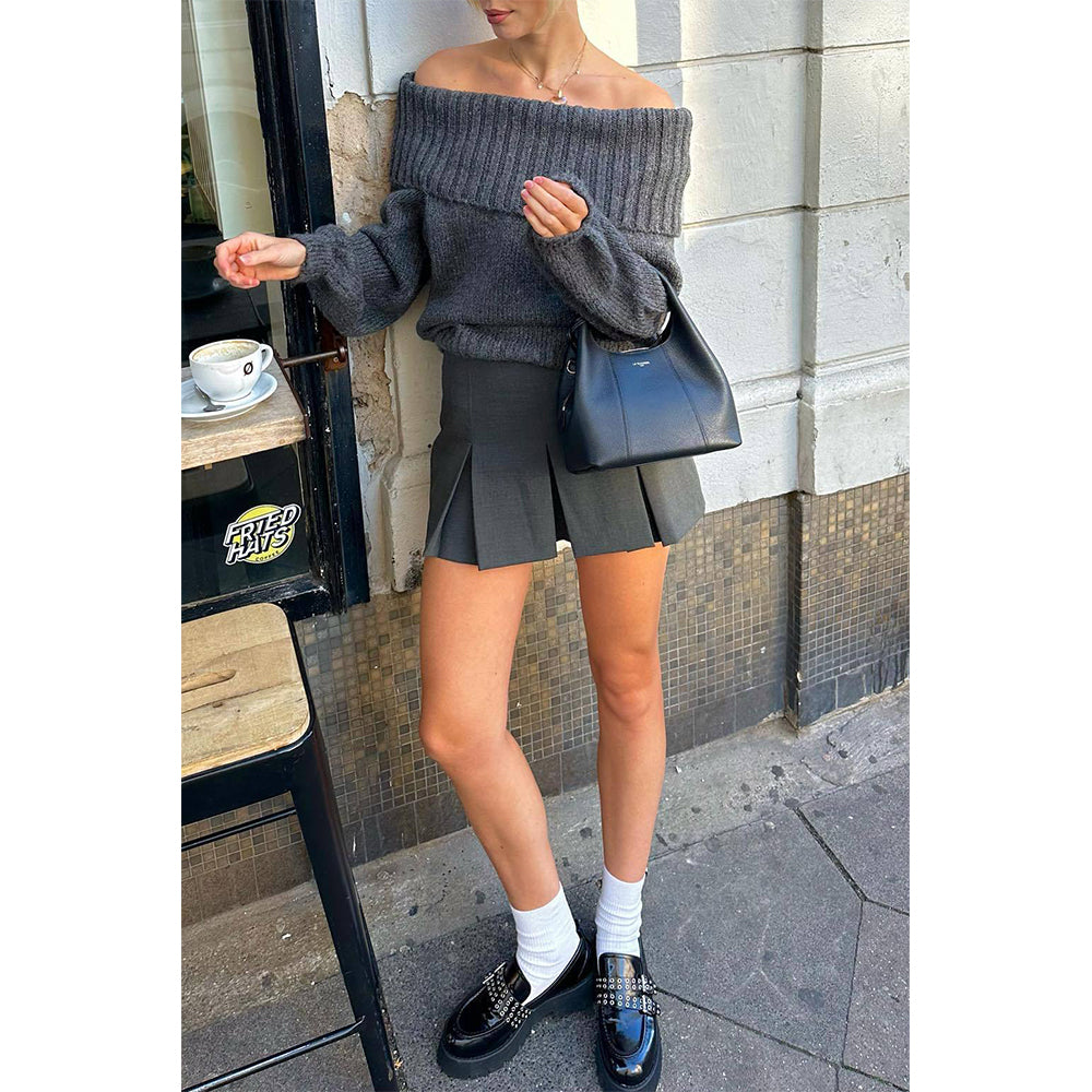 V For City Women's Autumn Winter Off-Shoulder Slim-Fit Solid Color Pullover Sweater