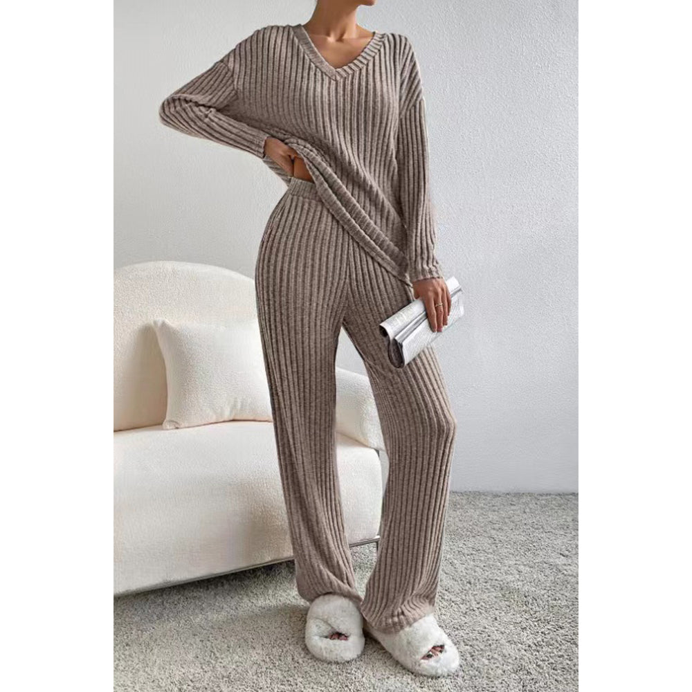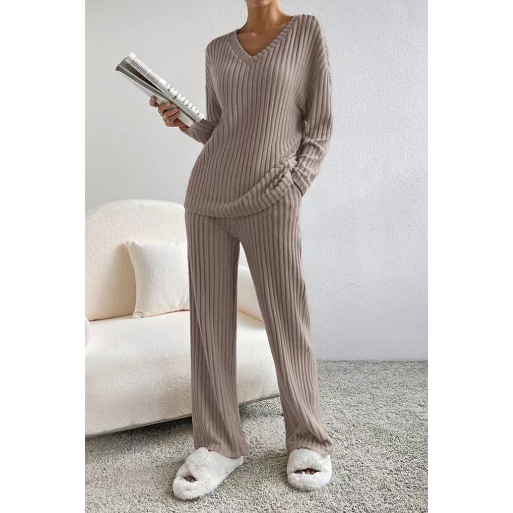 V For City Women's Fall/Winter Ribbed Knit Loungewear Set Loose V-Neck Top & Straight-Leg Pants Pajama Set