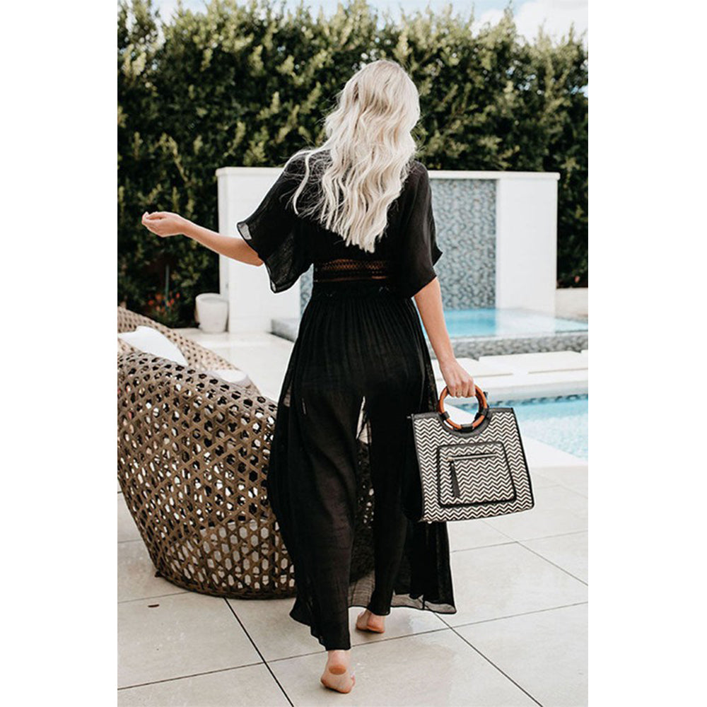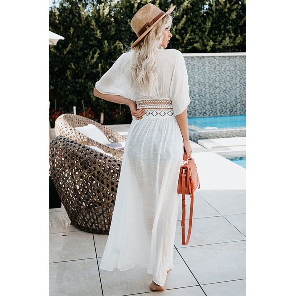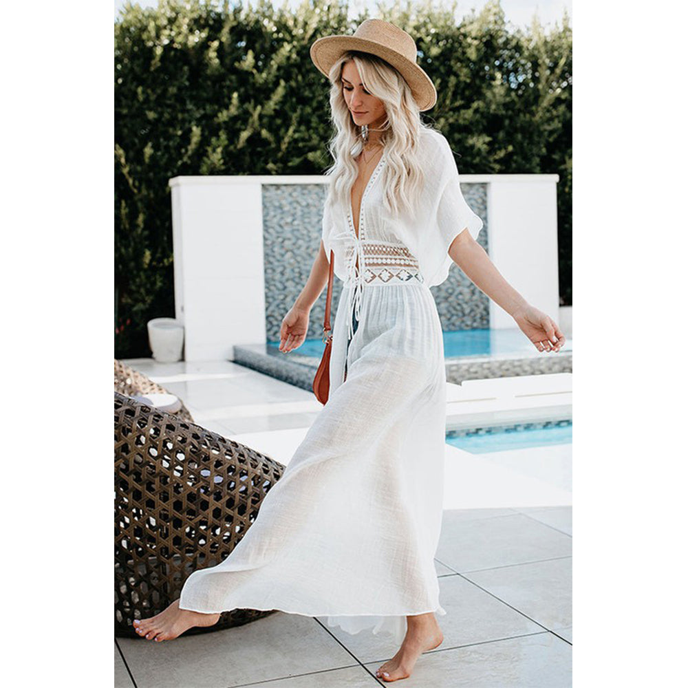 Charmo Women's Short Sleeve Maxi Cover Up Dress with Cutout Waist Drawstring & Side Slits