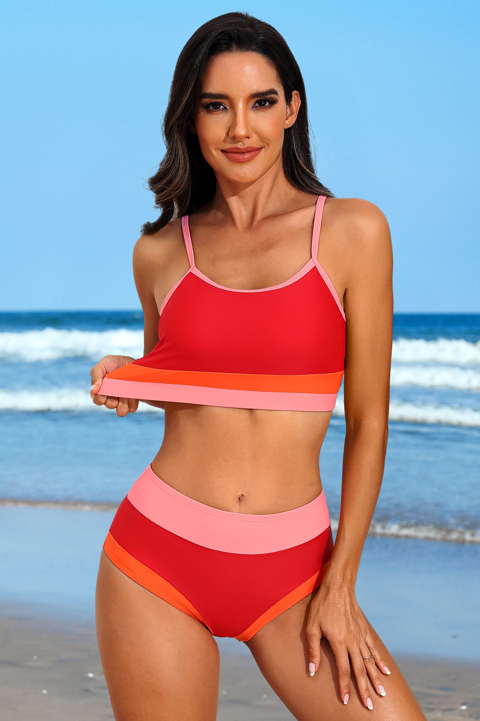 Design: This athletic color block stripe bikini bathing suit is designed with contrast eye-catching bright color which offer charming femininity