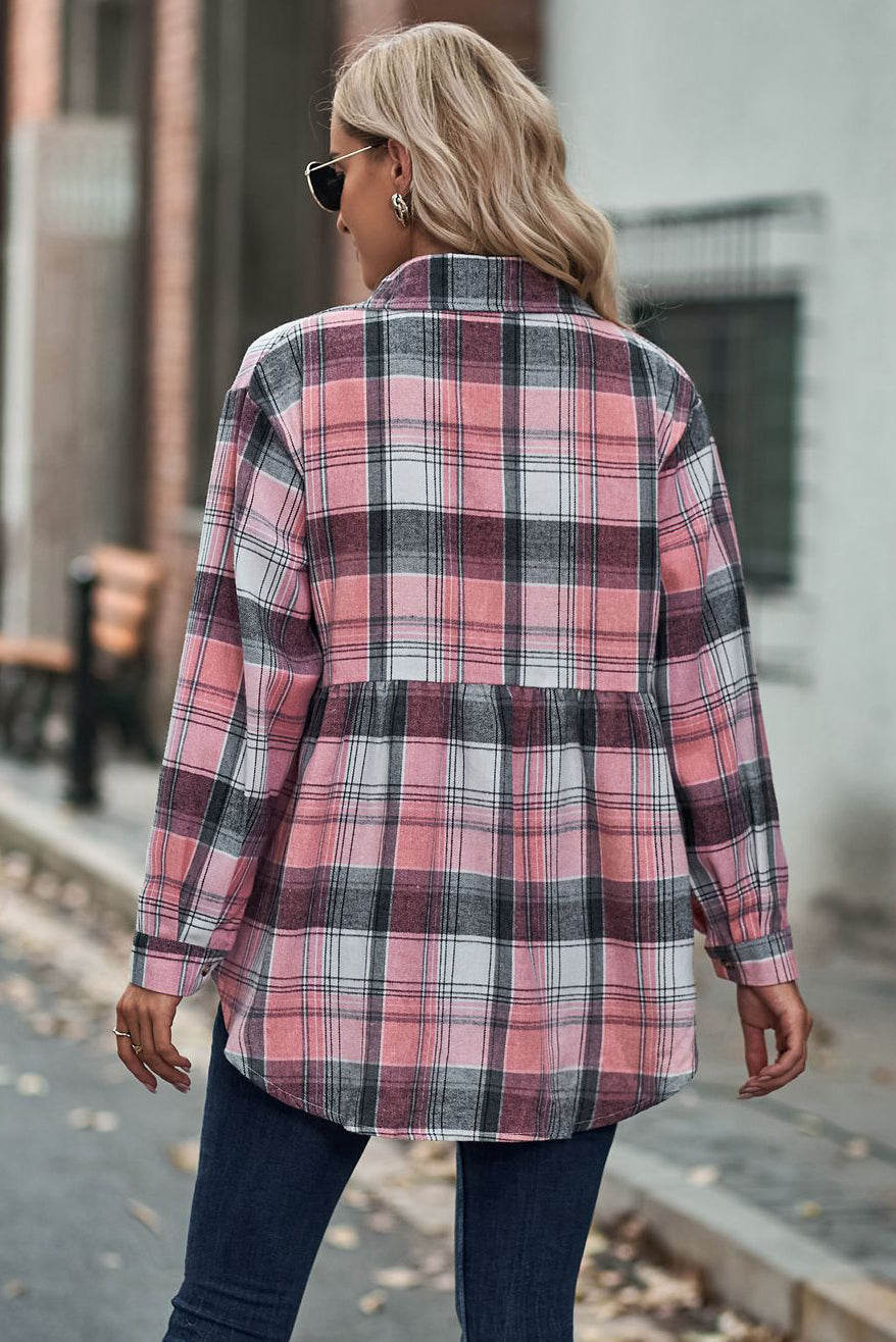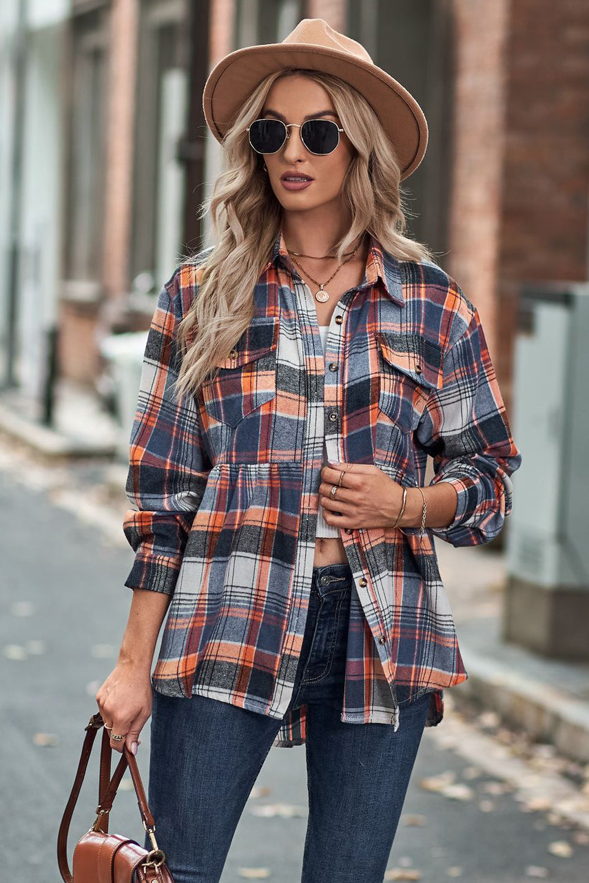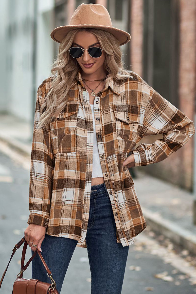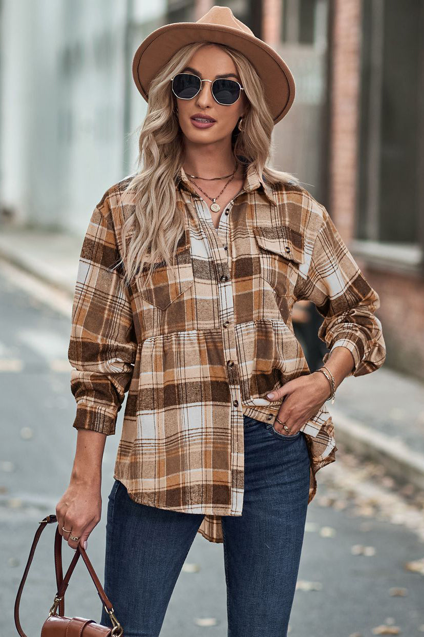 Plaid design, two chest pockets, loose fit, and hemline design take this top from simple to stunning