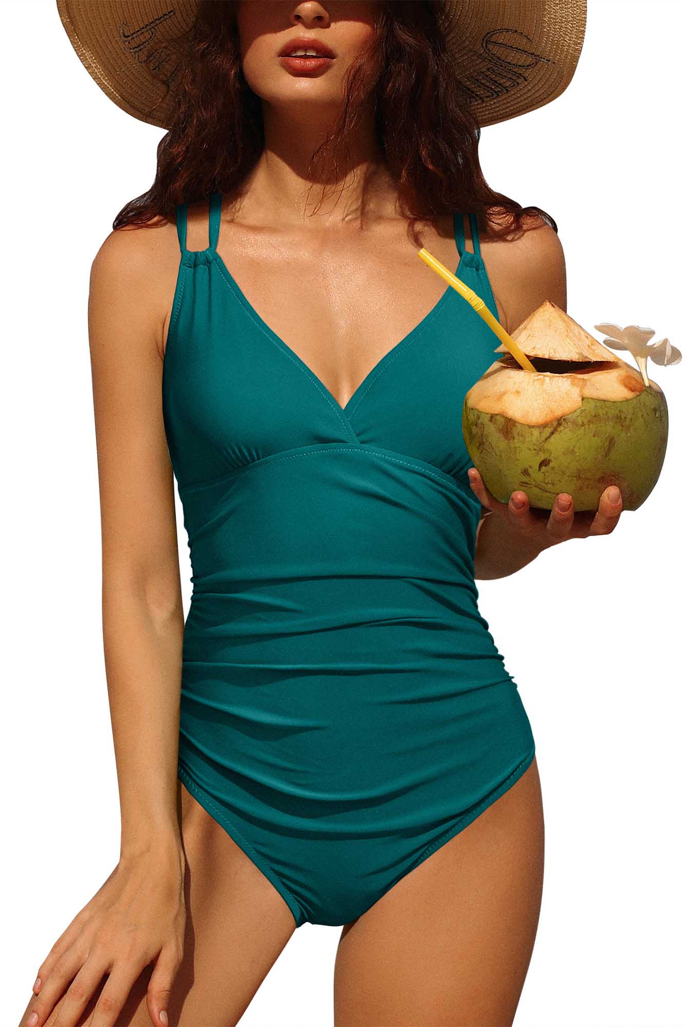 V neck padded one piece swimsuit features Ruched details to hide tummy pooch,shows flattering, slimming curves look.