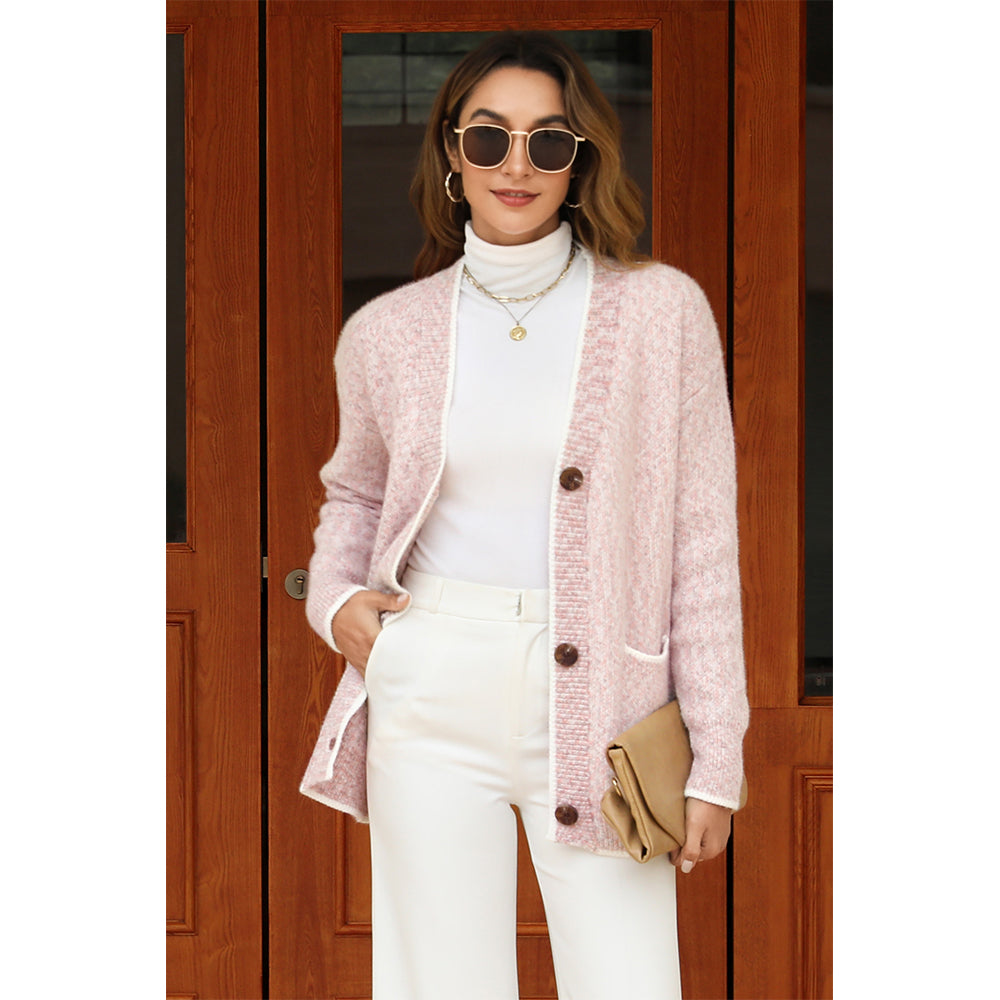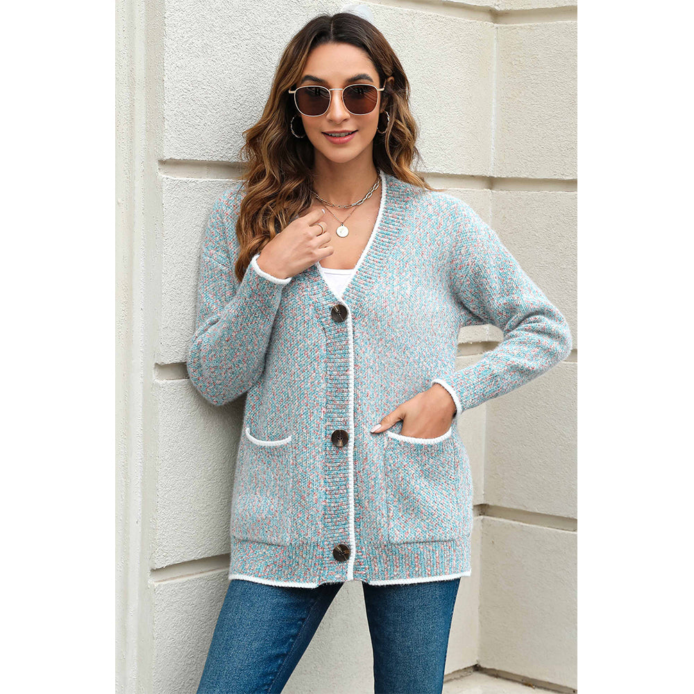 This cardigan showcases a stylish color - block design that adds a trendy touch. It features a V - neckline for a flattering look and long sleeves for warmth. The button - down front allows for easy wearing and adjustable styling. With convenient pockets, it combines fashion and functionality seamlessly, making it a perfect choice for casual outings.