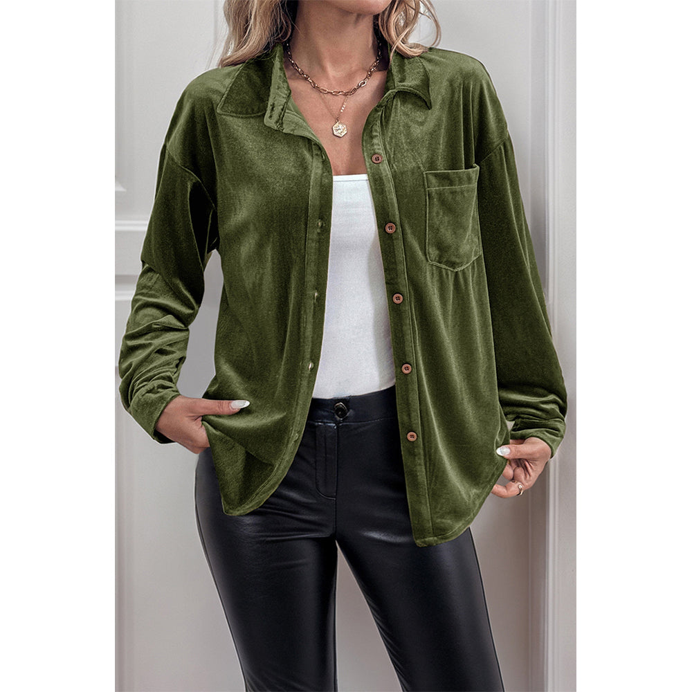 This shirt also features a chest pocket, adding a practical yet fashionable detail. Whether you layer it over a simple tank top for a casual day out or pair it with tailored pants for a business meeting, this velvet lantern - sleeve shirt is a versatile piece that combines comfort, style, and a hint of retro charm.